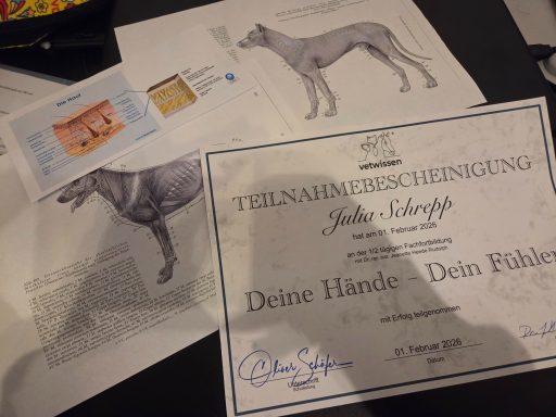 Ein schönes und kurzweiliges Seminar zur Palpation und sich einfühlen ins Gewebe. Während des Seminars durften wir sowohl am Mensch als auch am Hund üben, so dass man ein besseres Gefühl dafür bekommen hat, was sich wie anfühlt und was bereits kleine Bewegungen im Körper bewirken können.