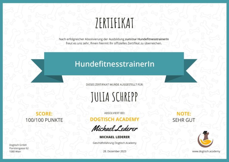 August 2023 - Dezember 2023 Hundefitnesstrainerin (Dogtisch Academy, Mag. med. vet. Karin Schreiner)