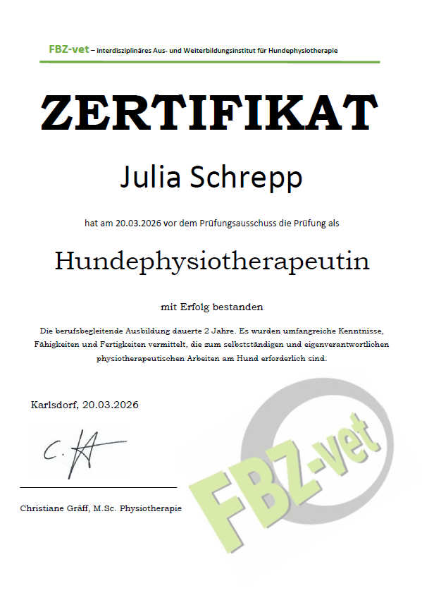 Januar 2024 - März 2026 Zertifizierte Hundephysiotherapeutin (FBZ-vet Christiane Gräff)